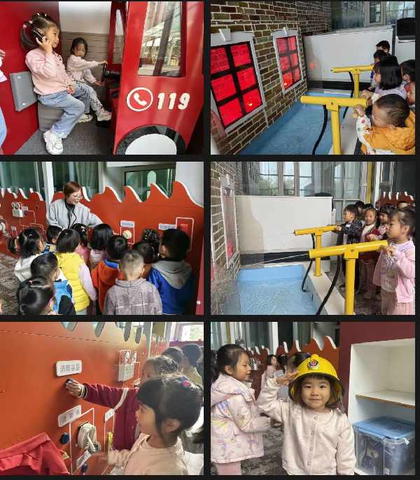 体验赋能:搭建实战“演练场” 园内的安全互动体验室成为了孩子们最生动的课堂。他们通过模拟体验消防车、消防灭火等设备,在高度仿真的情境中感知灾害,提升了自身的安全意识和防灾避险能力。