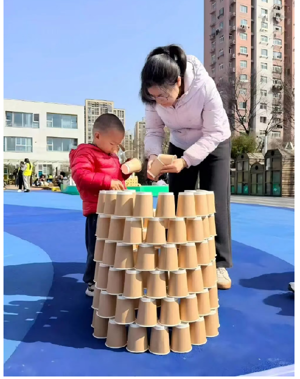 蕾蕾老师带领孩子们开启纸杯叠叠乐挑战,稳稳堆叠、比比高低,在游戏中感知平衡与空间,欢声笑语不断。