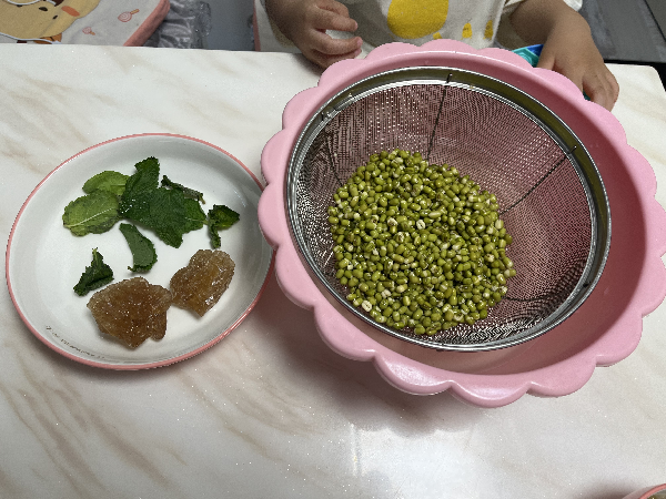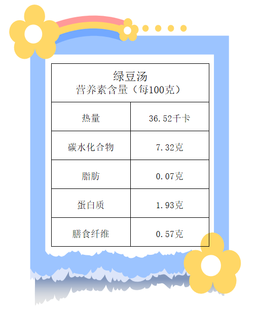 绿豆汤 推荐理由:幼儿可以适当的喝一些绿豆汤,绿豆汤可以有效的清热、利湿、解毒,有一定的消暑解毒的功效,可以预防中暑,对于一些口舌生疮有一定的改善作用。 营养分析: