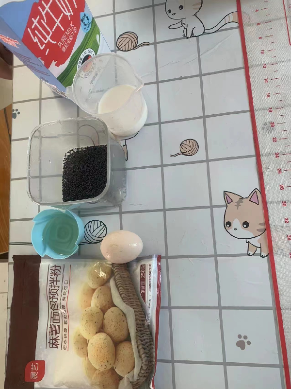 所需食材:麻薯面包预拌粉、鸡蛋、黑芝麻、牛奶、油