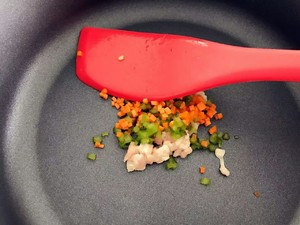 3.热锅,放入鸡蛋液中的配菜(肉糜、青椒和胡萝卜),中火翻炒2-3分钟,七八成熟后盛出备用