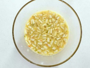 4.将鸡蛋、淀粉,配菜和茄子丁混合放入一个大碗中,加入少许盐调味,充分搅拌均匀,直至不结块