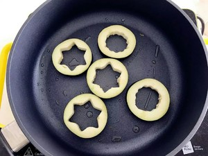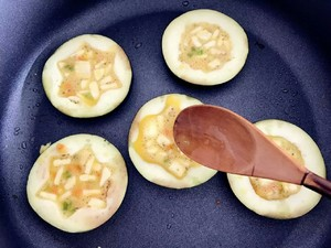 5.热锅,倒入少许油,放入茄子圈,中小火慢慢煎2-3分钟,可翻面。用勺子将鸡蛋液舀入茄子圈内,九分满即可,一直用小火慢慢煎,煎2-3钟左右蛋液慢慢凝固即可翻面,翻面后继续煎2-3分钟左右。