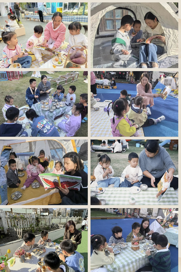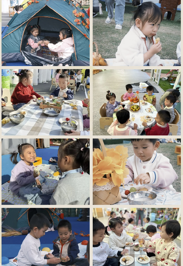 他们还亲身体验了“从田野到餐桌”的神奇旅程,回到家,更是变身“厨房小达人”,亲手制作秋天的味道~ 哇!秋日丰收庆典开始啦! 幼儿园变成了一个充满童话色彩的“秋日乐园”!孩子们和老师一起,用落叶、松果、干花,把操场和游戏场地装点成梦幻的“丰收庄园”。铺上野餐垫,摆好小餐具,一场温馨又热闹的秋日下午茶,准备就绪啦!