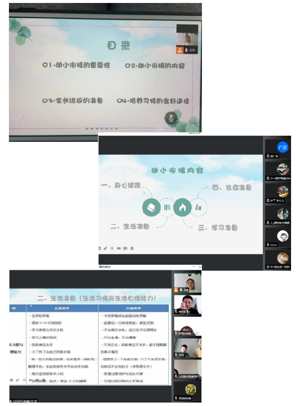 从幼儿园到小学,是孩子人生中非常重要的一个人生节点。因受疫情的影响,特殊时期做好幼小衔接工作更显重要。为了缓解大班家长面对“幼小衔接”的焦虑,帮助他们了解幼小衔接需要做好哪些准备,从而帮助孩子们顺利适应小学生活。因此,秀涓幼儿园大班组于2022年4月16日下午一点,开展“幼小衔接 我们在行动”线上家长学校专题活动。大班家长们积极响应,欢聚云端,一起行动,共同助力大班幼儿和家长科学地做好幼小衔接。 此次家长学校由大班年级组负责人吕萍老师主讲,吕老师从幼小衔接的重要性、幼小衔接的主要内容、家长该做的准备、习惯培养的良好途径四个方面详细介绍了如何科学地做好幼小衔接。