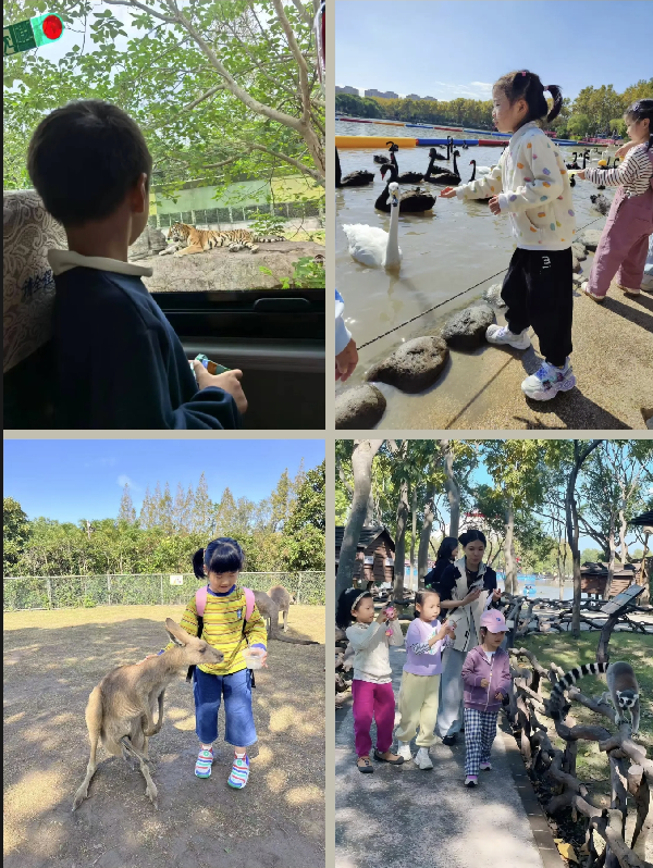 小玩童们对于这次实践活动充满了好奇与期待,早早地与同伴一起计划着想要探寻的奥秘。 PART TWO 秋游之我探索 大班《上海野生动物园》 到达野生动物园后,小玩童们来到海狮表演馆,近距离观看聪明海狮们的精彩表演,引得孩子们阵阵欢呼。接着,大家又迫不及待地走进步行区,小玩童们认真记录着灵长类动物、鸟类等各类动物的特征与行为,用眼睛发现、用小手记录、用心灵感受野生动物的神奇魅力。最后,坐车来到猛兽区,当看到威风凛凛的狮子、老虎在领地内踱步,孩子们既兴奋又有些害怕,紧紧拉着爸爸妈妈的手。