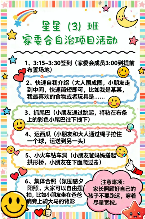 秋日的阳光,像甜甜的蜂蜜,涂抹在周末的草坪上。 上周末,在星星3班全体家委会的用心组织下,“秋日童乐会”亲子活动在欢声笑语中圆满举行。这不仅是一场秋日里的快乐聚会,更是一次心与心的靠近,家园共育成长的温暖实践。 从倡议到响应:温暖的集体奔赴 活动伊始,家委会在班级群发起的活动倡议迅速得到了家长们的热烈回应。从报名接龙到物资准备,从游戏设计到安全预案,从活动签到到环节组织,均由大家群策群力,充分展现了“我们班的事,我们一起办”的班级凝聚力。